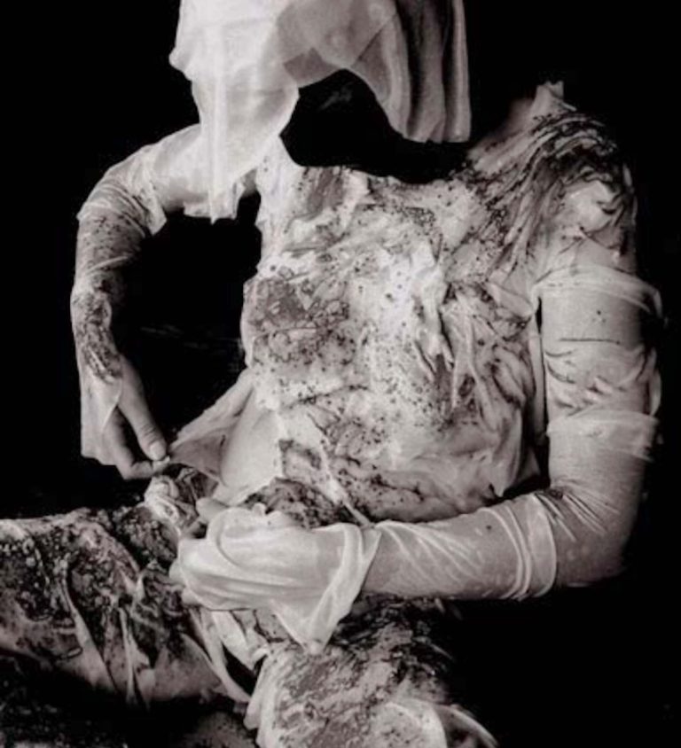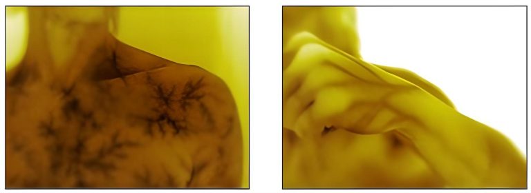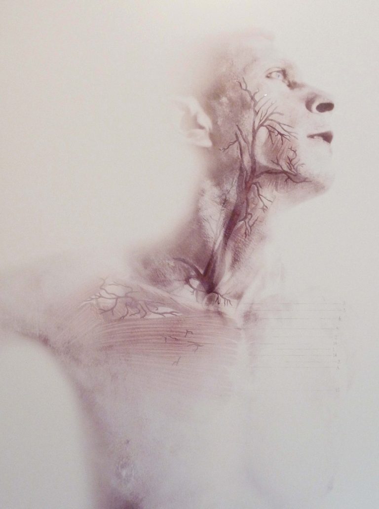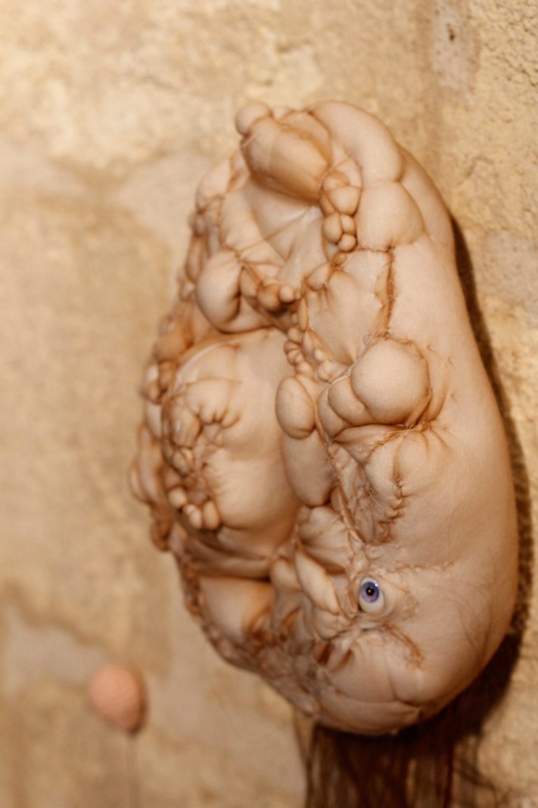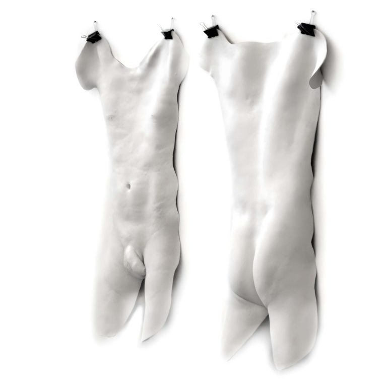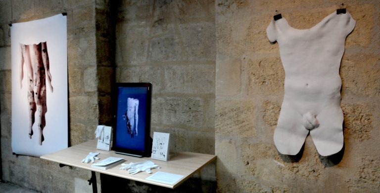 La seconde peau peut aussi symboliser une mutation, une métamorphose telles les mains fabriquées à partir de cotons usagés d’Alizée Grau, les crosnes, protubérances proliférantes qui « perspirent » de la peau du mur d’Ema Eygreteau, les cellules embryonnaires en pleine métamorphose de Thibault Messac, la mue de la peau de femmes sur les photos épidermo argentiques de Jean-Pierre Rey, les visages pixélisés des avatars déshumanisés des réseaux sociaux de Nathalie Si Pié et le changement de sexe exprimé dans la vidéo de Gérard Chauvin et Lanah Shaï. Les technologies de pointe permettent la création de peaux artificielles, de peaux en « 3D » comme celle présentée dans la vidéo d’Adrien Blatzezyk/A.ZYK. Cet artiste présente également un contre moulage de sa peau qui en simule la texture et l’élasticité. Le travail de Véronique Lamare, également très innovant, laisse entrevoir à la caméra thermique une certaine forme de notre intimité corporelle.
