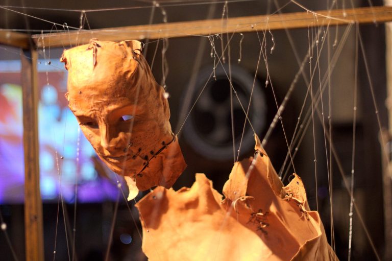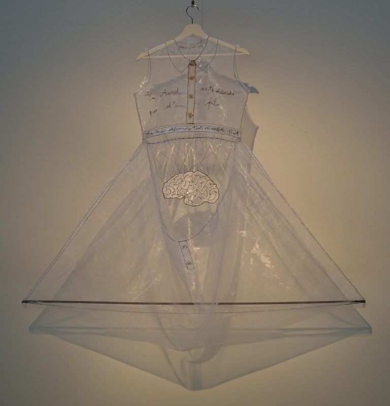 La robe transparente d’Aline Ribière, le justo-corps de Sophie Sourillan, le jean de Kilat fonctionnent comme une seconde peau. Ces vêtements enveloppent notre corps et le protègent tout en renvoyant des messages sur notre personnalité, notre style, notre statut social ou notre affiliation à tel ou tel groupe. Les coiffes tribales de Pierre Yvan Didry jouent également ce rôle et nous rappellent qu’elles donnent à ceux qui les portent le pouvoir d’influence ; l’accumulation d’objets ou les différentes panoplies représentées sur le corps des femmes dans les oeuvres d’Elissar Kanso et de Carmen Herrera Nolorve montrent de façon critique le statut des femmes dans nos sociétés ; les tatouages affichent eux aussi un message culturel, que ce soient les écritures sur le cuir d’une sculpture à taille humaine réalisée par Patricia Molins ou ceux, plus organiques, semblables à des veines en fine pellicule colorée d’Aurélie Martinez. La seconde peau peut également être perçue comme un objet de fétichisation, notamment dans le cas du zentaï, pratique japonaise consistant à porter un costume de latex recouvrant tout le corps. C’est ce que la compagnie l’Envers du décor a proposé avec la performance HIDE, défilé électro- zentaï qui a enflammé la soirée d’inauguration de la biennale.