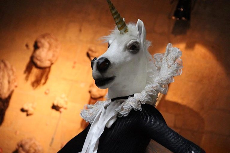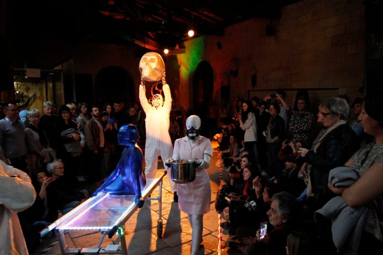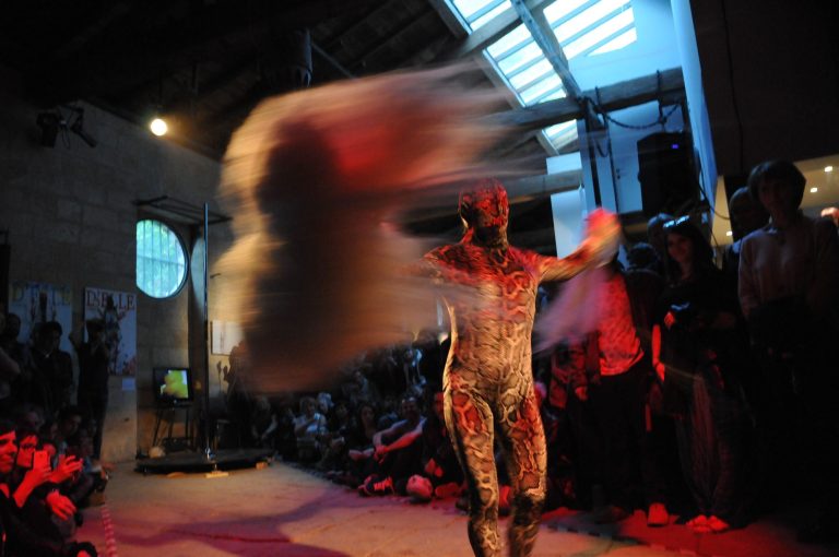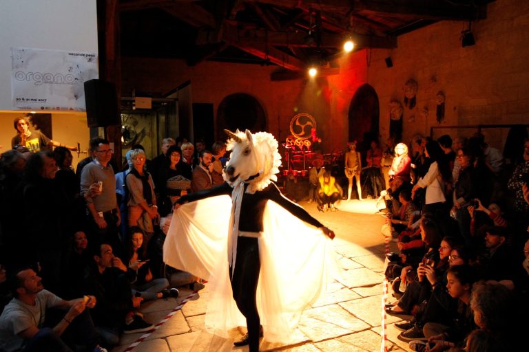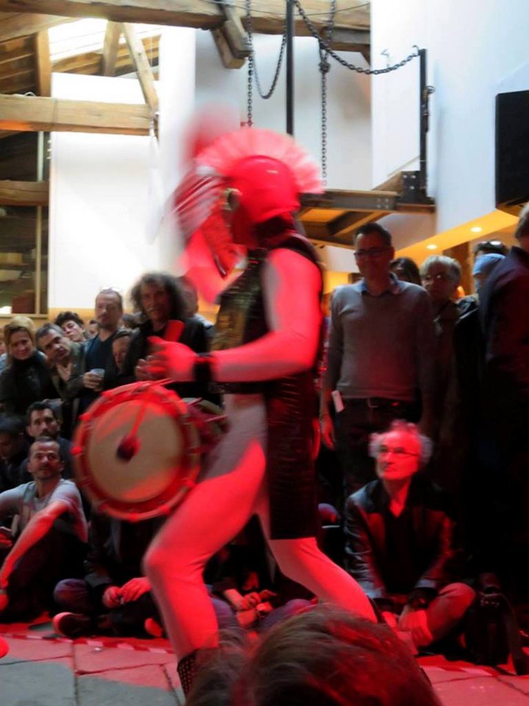 Suite au défilé électro-zentaï de la compagnie l’Envers du décor, la performance vocale textuelle amplifiée de Kimo Kopczynski clôture la soirée d’inauguration.