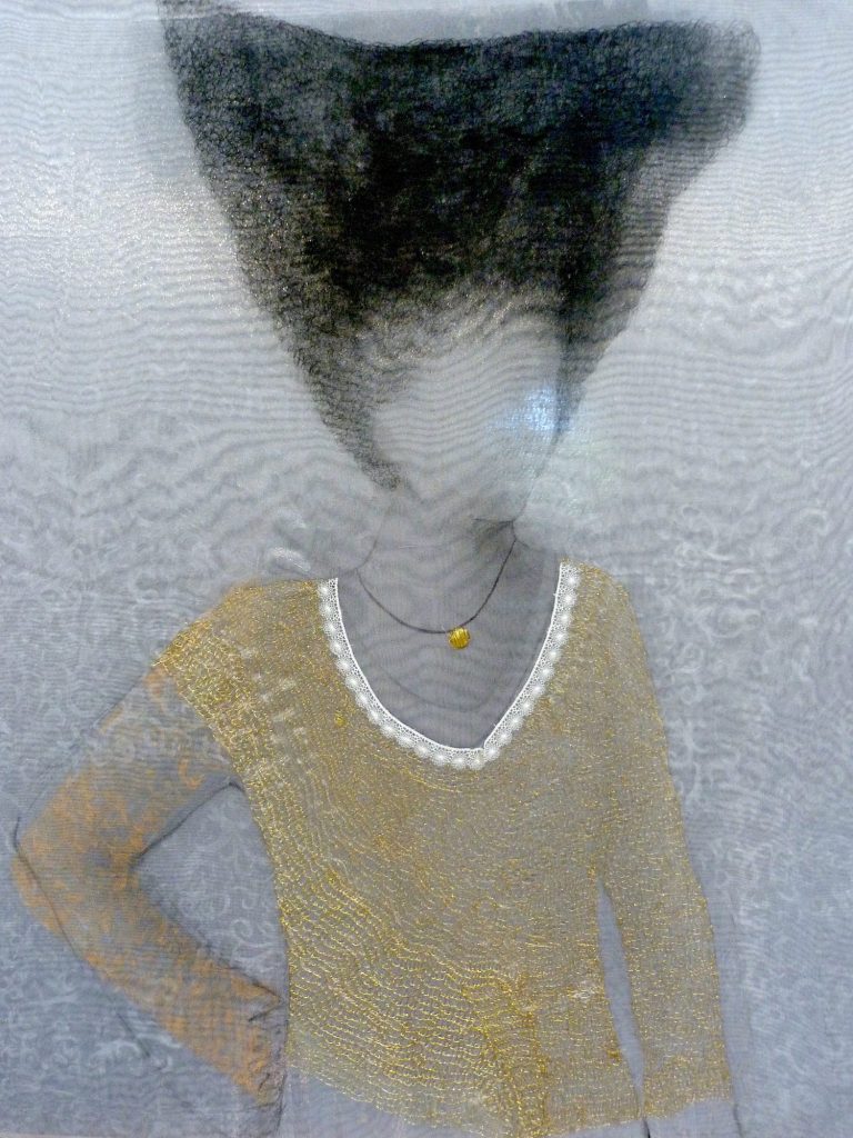 Pointe sèche, linogravure et cheveux naturels sur organza, 100 x 100 cm – 2017.