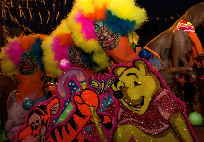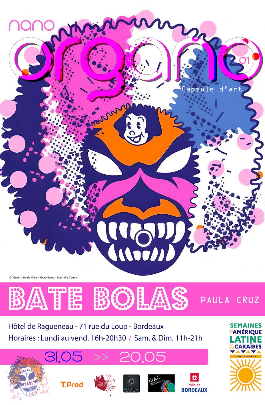 nano Organo01 présente les bate bolas et l'artiste brésilienne Paula Cruz. A travers les oeuvres présentées, on découvre le carnaval populaire des favelas porté par un figure emblématique et fascinante : les "Bate Bolas" les frappe-ballons. Ces clowns aux allures extravagantes et parfois inquiétantes envahissent les rues au rhytme du funk dans un tourbillon de feux d'artifice. Leur signature? Un bâton autour duquel est attaché un filet contenant une balle en plastique qu'il frappe bruyamment contre le sol, créant un spectacle sonore et visuel unique. Leurs costumes sont tout aussi impressionnants : flamboyants, colorés et inspirés de la culture populaire contemporaine comme le cinéma, les jeux vidéos ou encore la bande dessinée. Une explosion de créativité faisant des bate bolas un symbole vivant de l'expression populaire brésilienne.